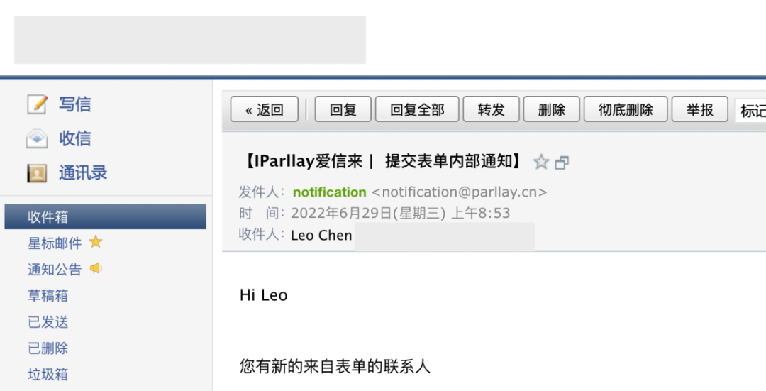 “潜客在三天前提交资料,但今天查看表单才知道”,这是很多B2B营销人员的痛点,也是很多第三方表单工具的缺点,即只有收集信息功能,无法做到及时提醒。iParllay爱信来深知每一个线索来之不易,在潜客资料通过表单提交的第一时间,就会通过邮件通知,让企业及时和客户沟通,避免线索流失。