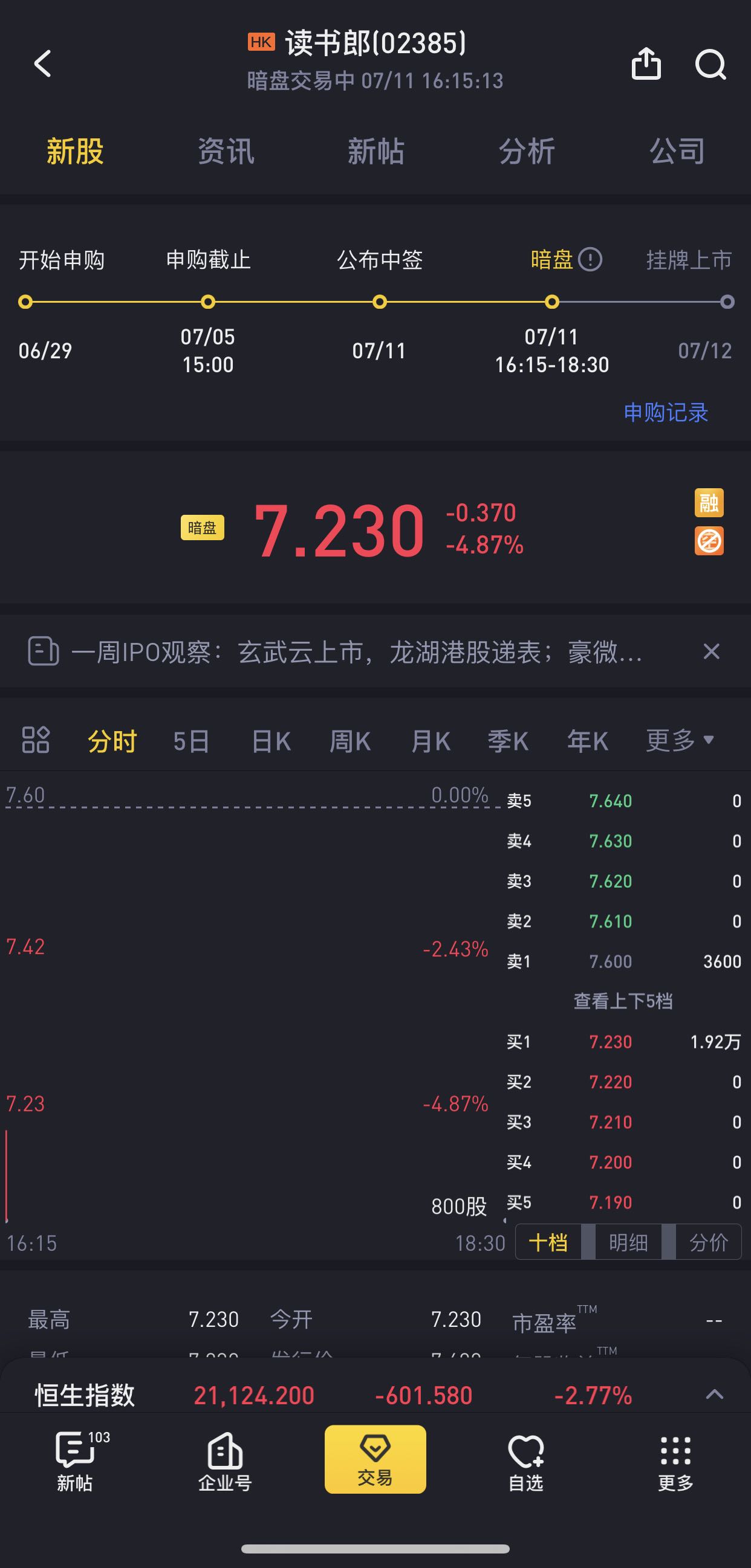 7月11日,$中康控股(02361)$暗盘报5.1港元,较发行价跌4.85%,公司每股定价5.36港元,每手500股;$读书郎(02385)$暗盘报7.23港元,较发行价跌4.87%,公司每股定价7.60港元,每手400股,两只股票均将于7月12日(周二)港股挂牌上市。