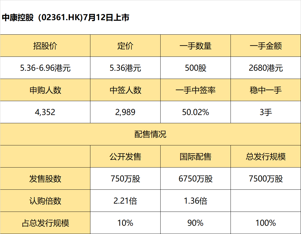 在此前的公开认购阶段,中康控股共有4352人申购,中签人数2989人,一手中签率50.02%,认购倍数2.21倍。老虎资讯整理相关数据如下表: