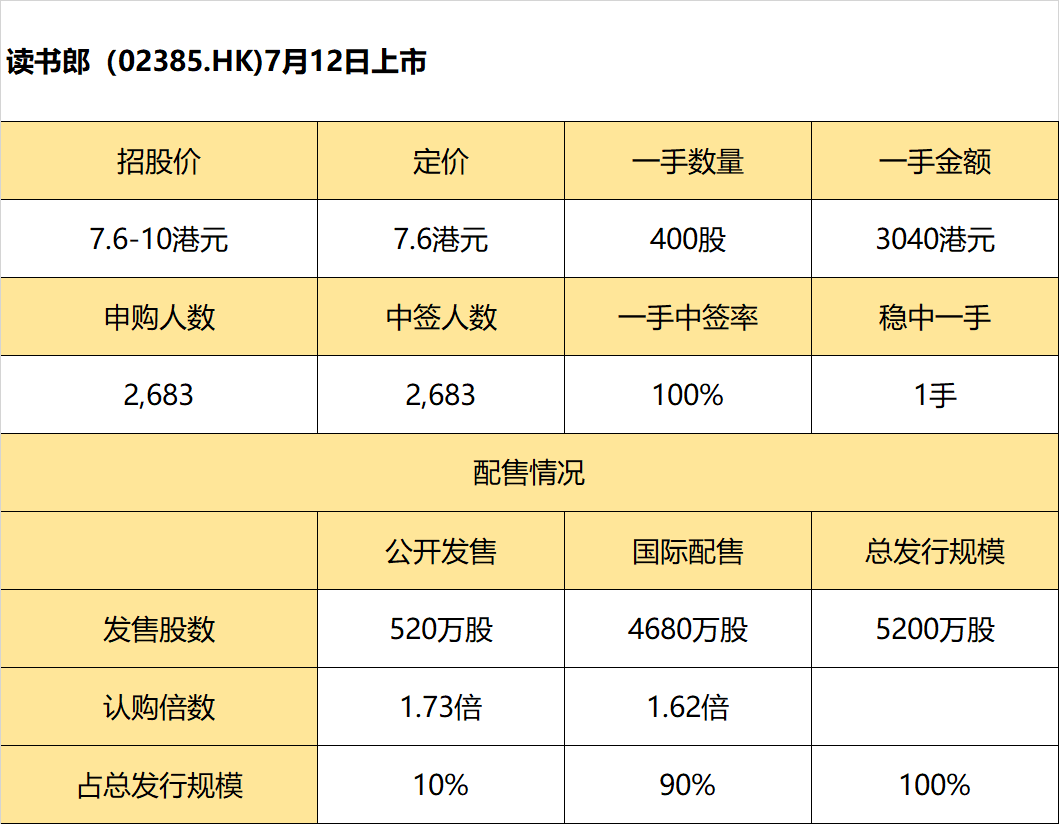 在此前的公开认购阶段,读书郎共有2683人申购,中签人数2683人,一手中签率100%,认购倍数1.73倍。老虎资讯整理相关数据如下表: