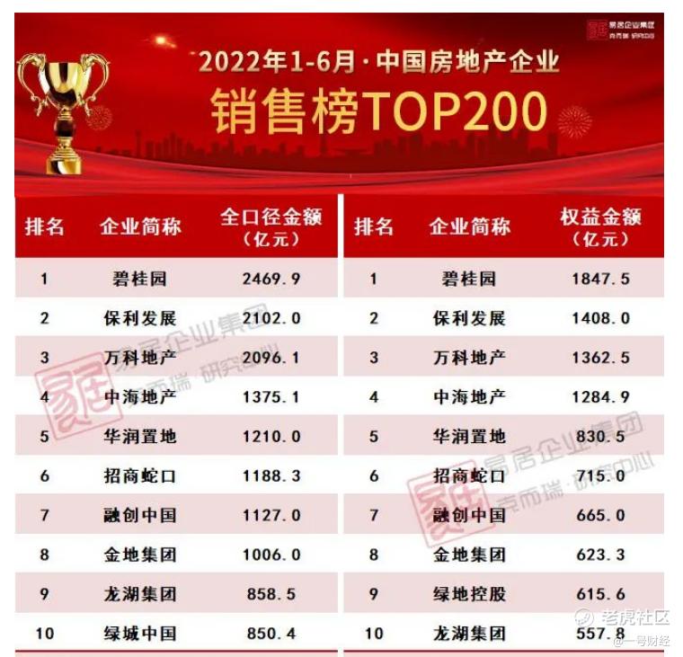 日前,克而瑞地产研究公布了今年上半年百强房企销售榜单,碧桂园仍然以2469.9亿元的全口径销售、1847.5亿元的权益销售金额稳居行业销售第一。