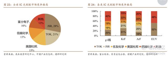 半导体光刻胶市场的前五中除了美国杜邦,其余四家均为日本企业。其中JSR、TOK的产品可以覆盖所有半导体光刻胶品种,是绝对的龙头,尤其在高端EUV市场高度垄断。
