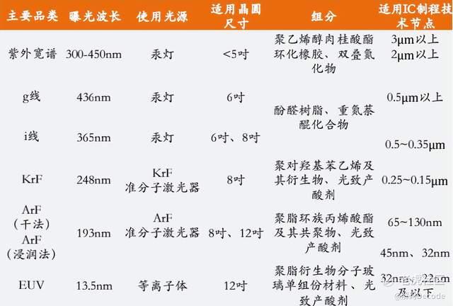 其中,今天的主角也就是半导体光刻胶,按照光源波长的从大到小,可分为紫外宽谱(300-450nm)、g线(436nm)、i线(365nm)、KrF(248nm)、ArF(193nm)、EUV(13.5nm)等主要品类,每一种品类的组分、适用的IC制程技术节点也不尽相同。