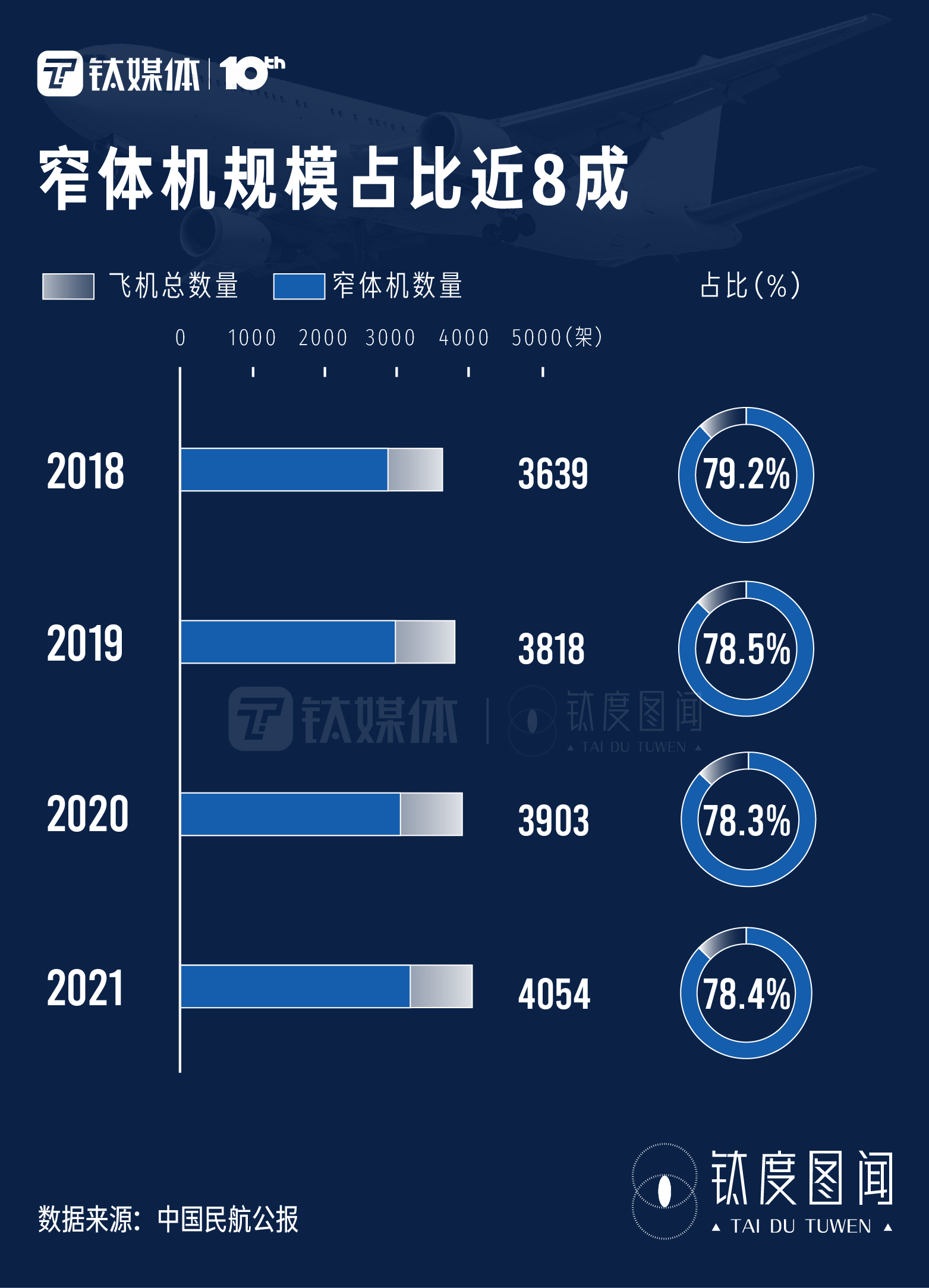数据显示,窄体机规模在中国保持稳定,在中国民航运输机队中的占有率近八成。截至2021年底,窄体飞机数量为3178架,比上年增长了120架,可见中国民航机队是以窄体机为主。
