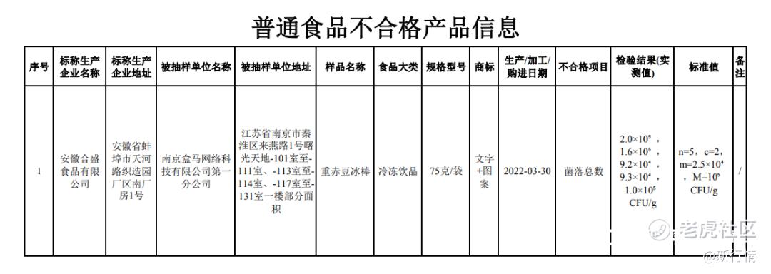 7月1日,南京市市场监督管理局官网发布关于1批次食品不合格情况的相关通告,显示南京盒马网络科技有限公司第一分公司销售的重赤豆冰棒,菌落总数不符合食品安全标准规定。