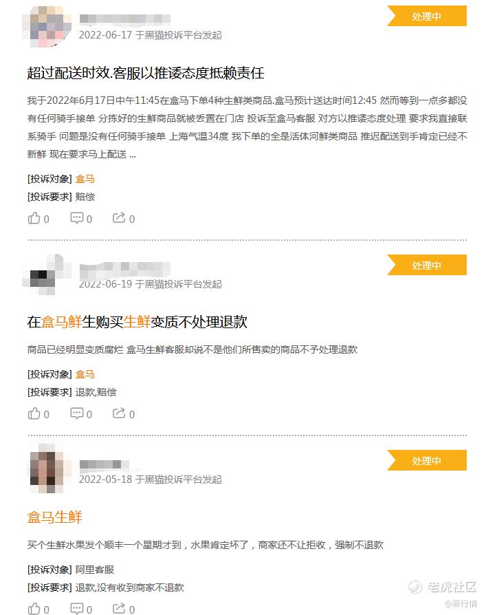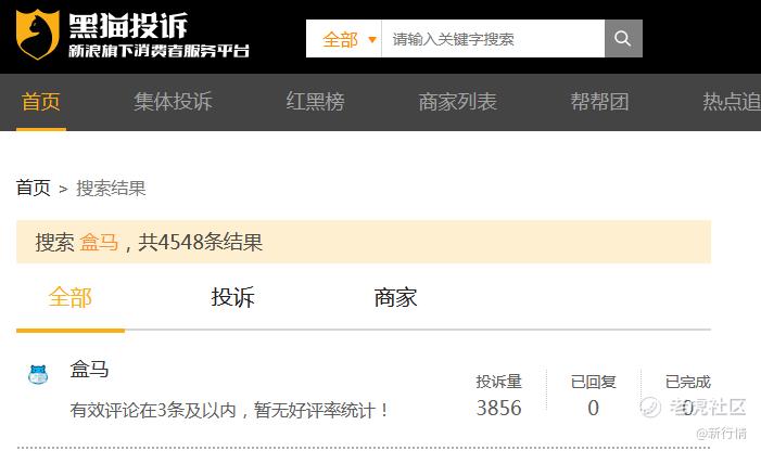 在黑猫消费者投诉平台上可以发现,关于盒马的投诉量为3856条,大部分是平台的强制退单、拒绝退款、食品质量有异常、客服售后不作为等问题。