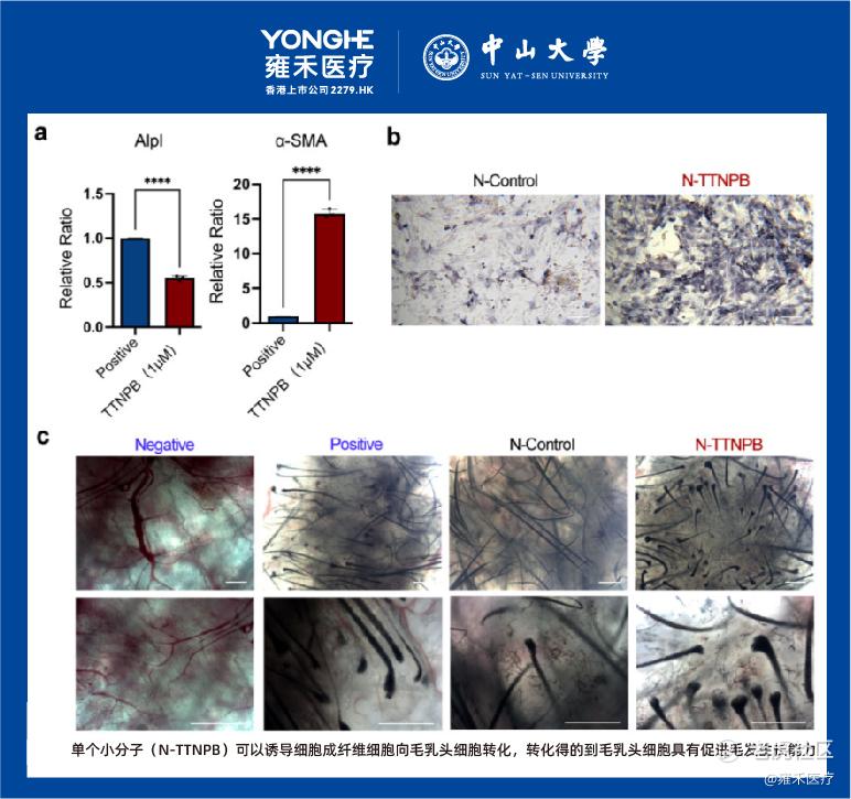 也就是说在雍禾医疗与中山大学合作研究成果中,通过小分子药物将成纤维细胞转变成为具有毛囊生长诱导能力的毛乳|头细胞,为后续体外培养毛乳|头细胞并用于脱发治疗提供了简单有效的方案,为自身毛发资源匮乏的发友带来毛囊再生的希望,是毛发行业的革命性突破学术成果。