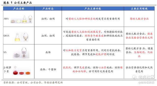 嘉必优是国内营养素生产企业的龙头,最初主要进行多不饱和脂肪酸ARA的生产,并逐渐拓展到藻油DHA、燕窝酸SA和β-胡萝卜素。