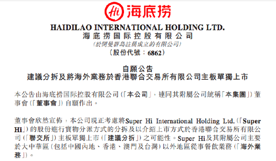 7月11日晚,海底捞发布公告称,正在考虑将Super Hi公司股份进行实物分派方式的分拆,并以介绍上市方式于港交所主板单独上市的可能性。Super Hi及其附属公司主要于大中华区以外地区从事餐饮业务。