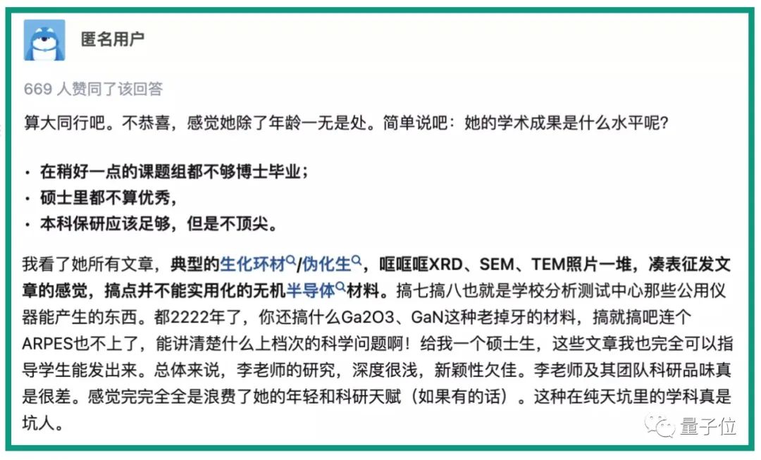 有很多人扒了李悦文的论文,才发现她学的是电子工程,但是研究的都是一些“不能实用化的无机半导体材料”,就像一个“伪化生”。