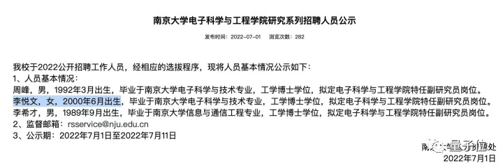 经过11天的公示期,她被聘为南京大学电子科学与工程学院特任副研究员。