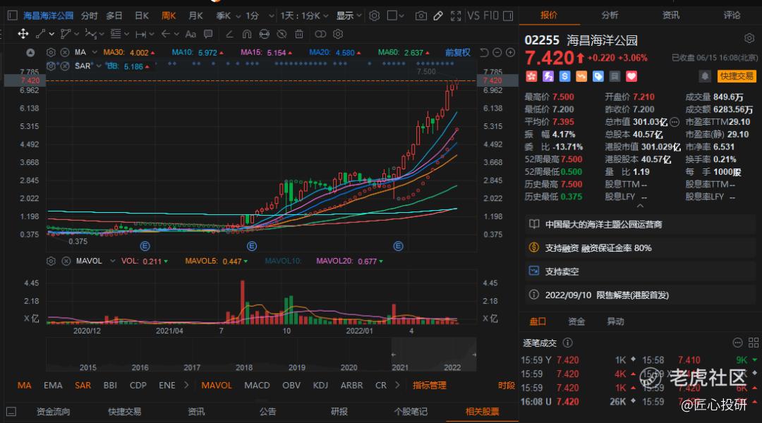2255 海昌海洋公园一年多涨了20倍。前迪士尼香港总裁加盟海昌海洋公园,能想象的到吗?1年前这只股市场才给15亿的估值?还是港币哦,现在市值300亿了,马上还可能回港股通。