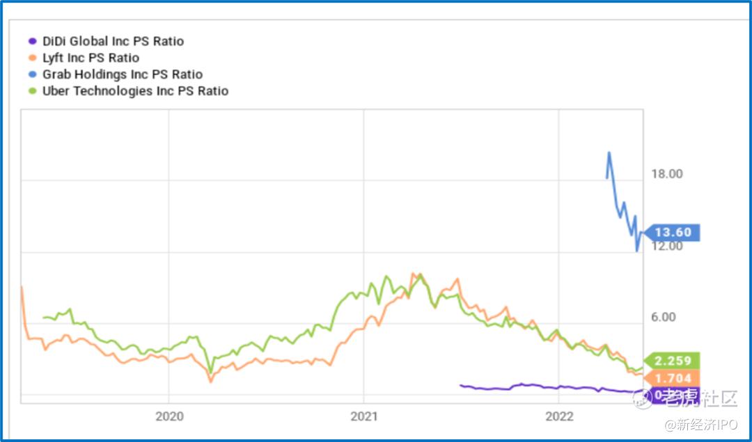 滴滴、Uber、Grab、Lyft 市销率比较。