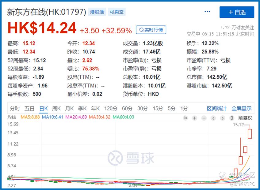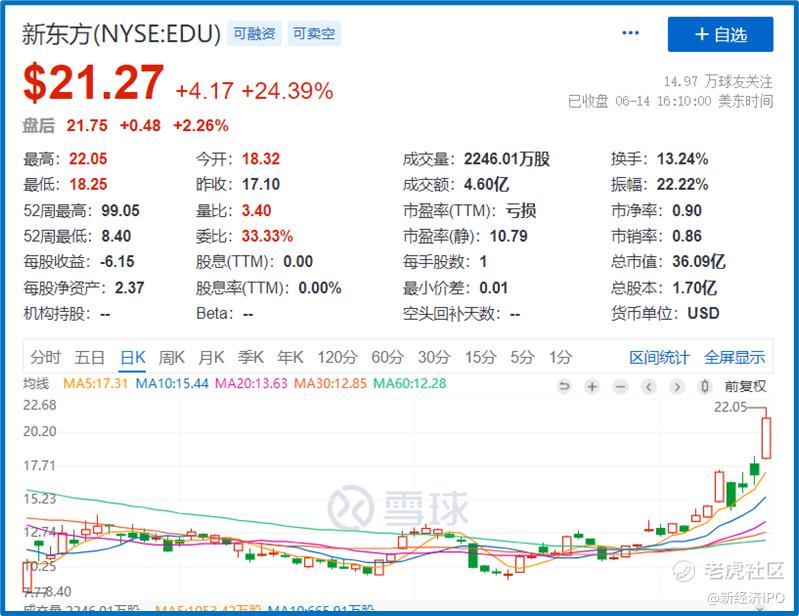 另一个案例是新东方,受监管课外培训政策的影响,新东方从199美元的高峰暴跌至8美元,跌幅95%。最近,在新东方创造性转型双语直播卖货后,新东方股价出现暴力反弹,截至6月15日,美股新东方股价报收21.27美元,半个月涨幅100%;港股新东方在线更加凶猛,4天从4港元涨到16港元,涨幅400%。