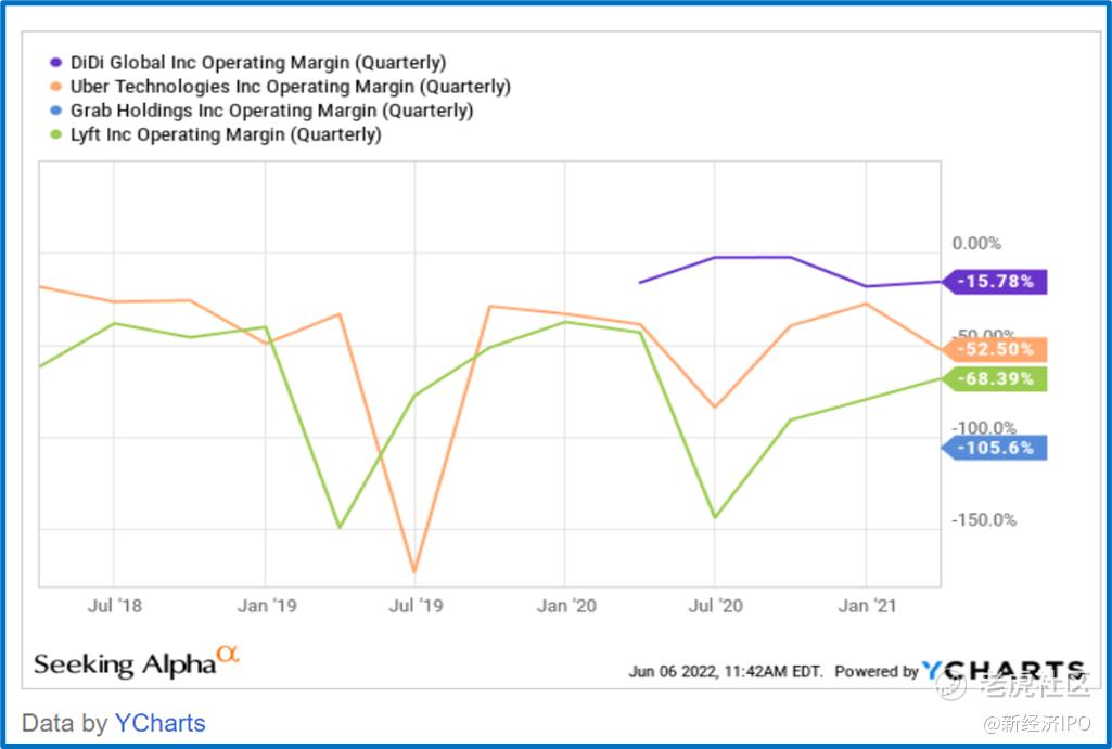 滴滴、Uber、Grab、Lyft营运利润率比较。