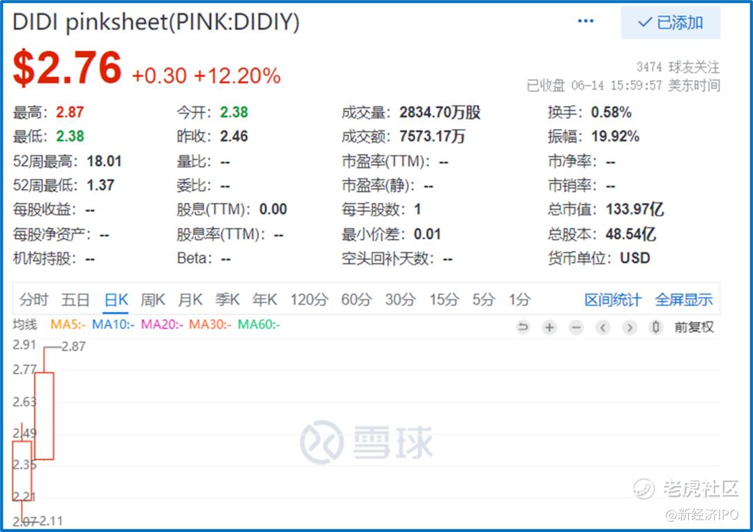 众所周知,不存在长期被低估的股票。滴滴转入粉单市场后两天,连续上涨2天,从最低2.11美元上涨至2.76美元,区间涨幅30%。这意味着,滴滴估值正在出现快速修复。