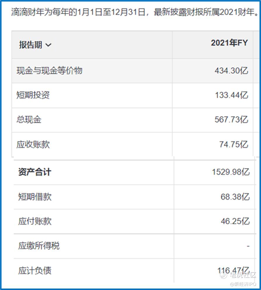 从财务报表看,截至2021年末,滴滴手持现金567.73亿元,其中现金和现金等价物433.3亿元,短期投资133.44亿元;短期借款加应付账款116.47亿元,长期借款16.8亿,净现金434亿元。