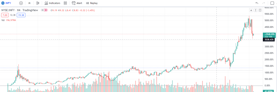infosys在印度交易所1993年上市至今,30年来,股票前复权的回报达到近2000倍。