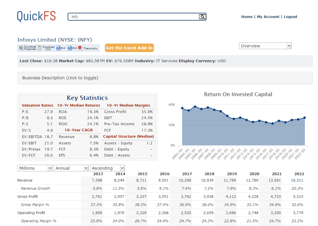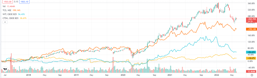 而且还体现在比同行更优的经营表现上,从过去几年的表现看,infosys跑赢了TCS,WIT和CTSH等多个外包公司。而过去5年的表现,也是infosys更优。