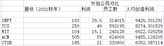 infosys,还是印度IT外包行业老大TCS(塔塔咨询外包),都有20%以上的净利润率,而埃森哲的利润率只有15%左右,即使是经营能力相对最弱的Wipro,也能做到比埃森哲更高的利润率。