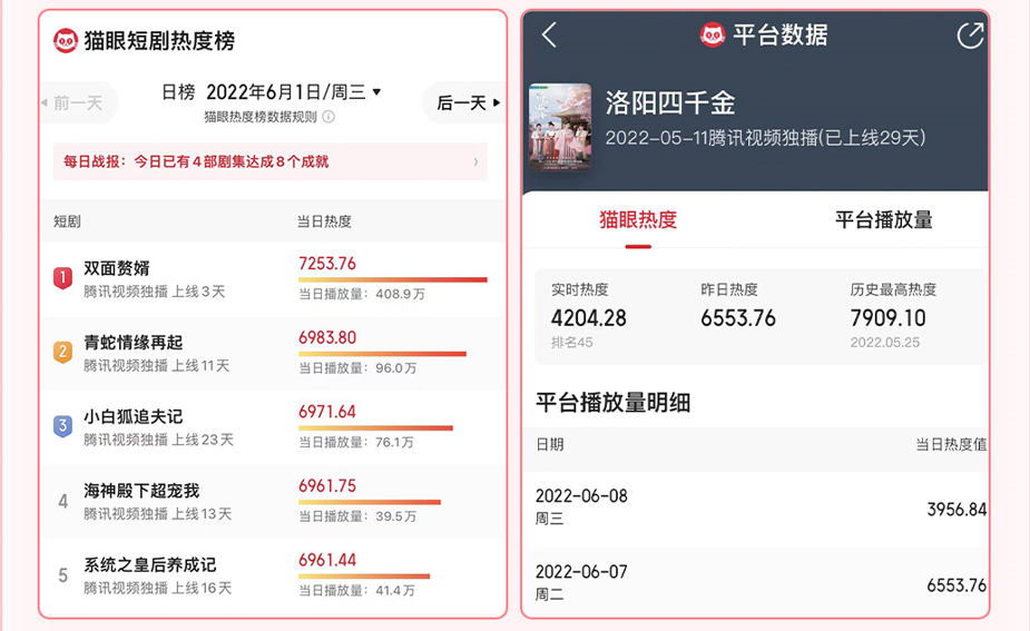 在热度方面,据猫眼短剧热度榜显示,腾讯视频、芒果TV、优酷三大平台的头部短剧猫眼热度历史峰值不超过8400,而长剧的猫眼热度值上限可达9900,从热度量级上看,短剧在长视频站内也仍然是待拓展的新品类。
