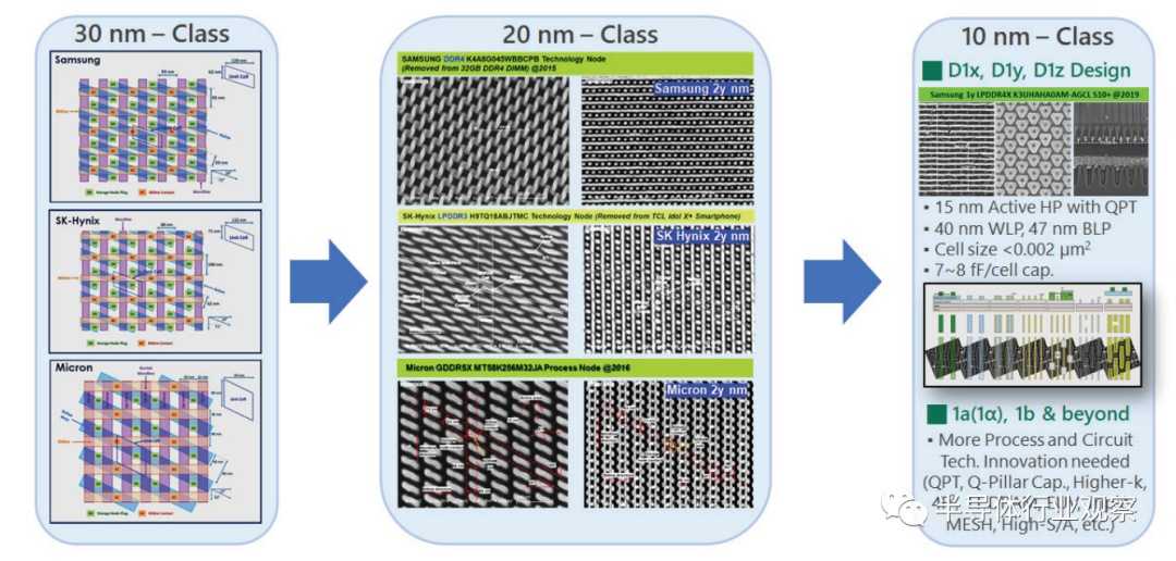众所周知,由于工艺完整性、成本、单元泄漏、电容、刷新管理和传感裕度方面的挑战,单元缩放正在放缓。从先进的DRAM单元设计中可以看到一些创新技术,例如高k介电材料、柱状(或准柱状或单面)电容器工艺、凹槽通道S/A晶体管和HKMG采用。