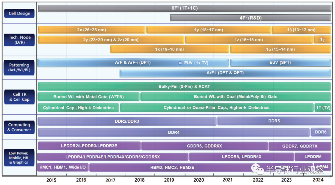 图 2. DRAM 设备的技术/应用路线图显示 6F2 1T+1C 单元设计扩展到更多下一代 DRAM,尽管 DRAM 厂商一直在开发 4F2 单元结构,例如 1T DRAM 或无电容器 DRAM 原型。