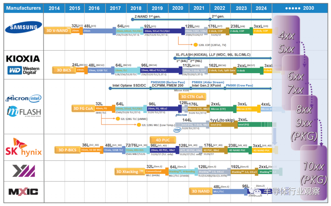 而主要的 NAND 制造商正在竞相增加垂直 3D NAND 门的数量,并推出了 1yyL 3D NAND 设备。例如,三星 V7 V-NAND、铠侠和西部数据公司 (WDC) BiCS6、美光第 2 代 CTF CuA 和 SK 海力士第 2 和第 3 代 4D PUC NAND 。