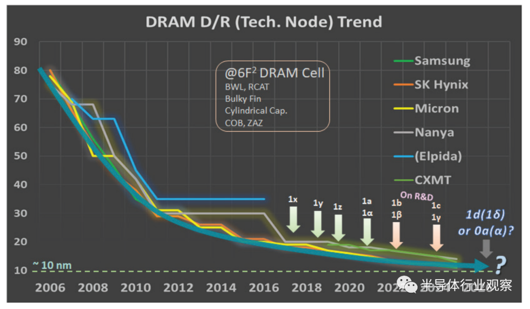 图 4. DRAM D/R 趋势显示 6F2 单元设计的局限性。2027 年或 2028 年,10nm D/R 将是 6F2 DRAM 的最后一个节点。
