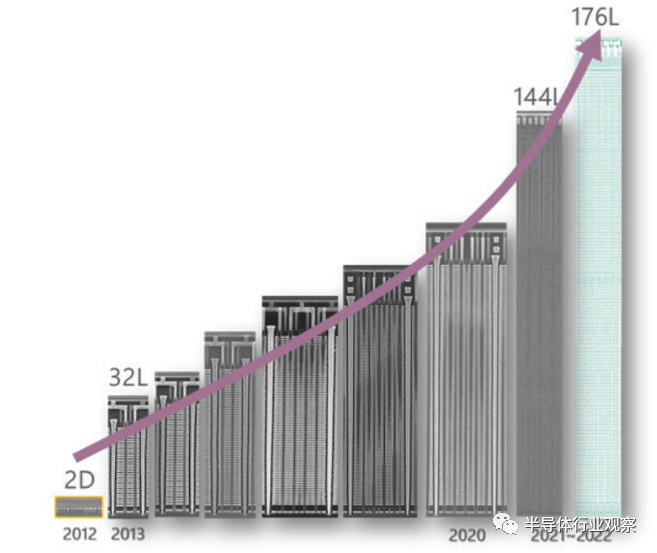 图 8. 3D 垂直 NAND 串高度的比较。新发明的 176L 产品距source plate的高度为 12µm。