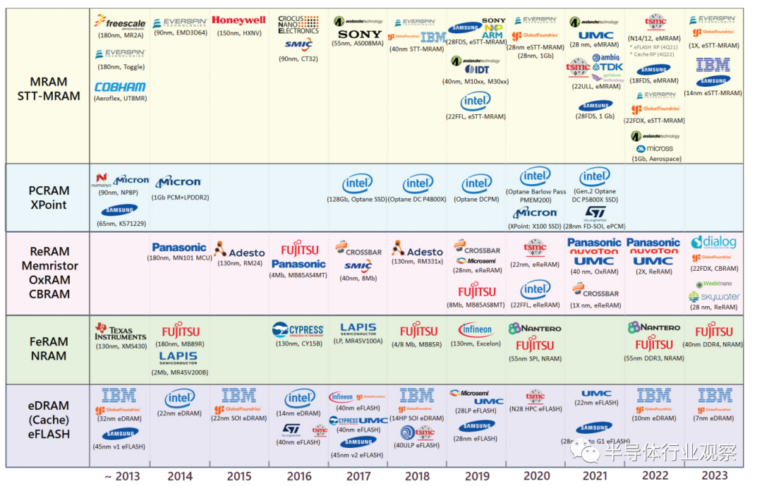图 9. TechInsights 的新兴内存路线图,包括 STT-MRAM、PCRAM/XPoint、ReRAM/CBRAM、FeRAM 和嵌入式 DRAM/FLASH 内存。