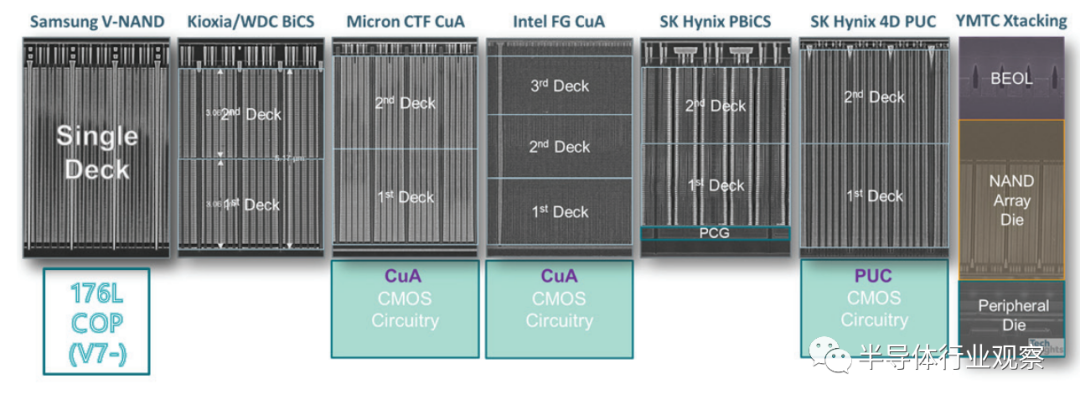图 6. 七种不同的 3D NAND 原型已被提出并成功生产:V-NAND、BiCS、FG CuA、CTF CuA、P-BiCS、4D PUC 和 Xtacking。