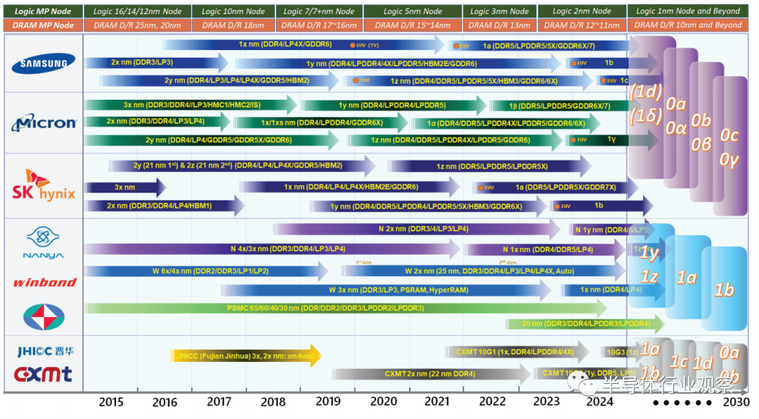 图 1.由TechInsights 提供的 DRAM 路线图,显示 2020 年至 2022 年市场上商业化的 D1z 和 D1a DRAM 产品。到 2030 年,将生产出D1d(或 1δ)、D0a(或 0α)和 D0b(或 0β)等几代产品。