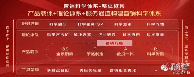最底层是营销环节中必备的科学工具,如多触点归因、优投实验室等科学度量场景所使用的工具,中间的产品载体是营销方略,再往上是解决方案及科学方法论、行业研究、科学应用、科学度量;最上面是由行业专家、院派学者、科学服务ISV与京东自营科学团队组成的专业服务通道。
