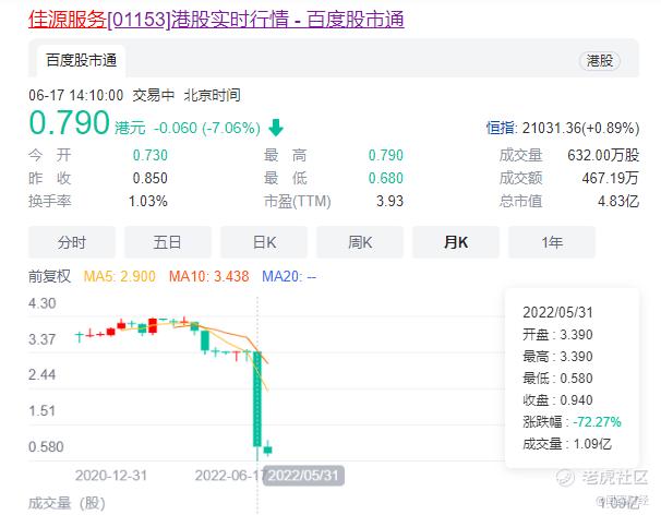 2020年12月,佳源服务在港上市,发行价为3.86港元/股。今年5月,其股价突然跳水,当月累积跌幅达72%,沦为1港元以下的“仙股”。