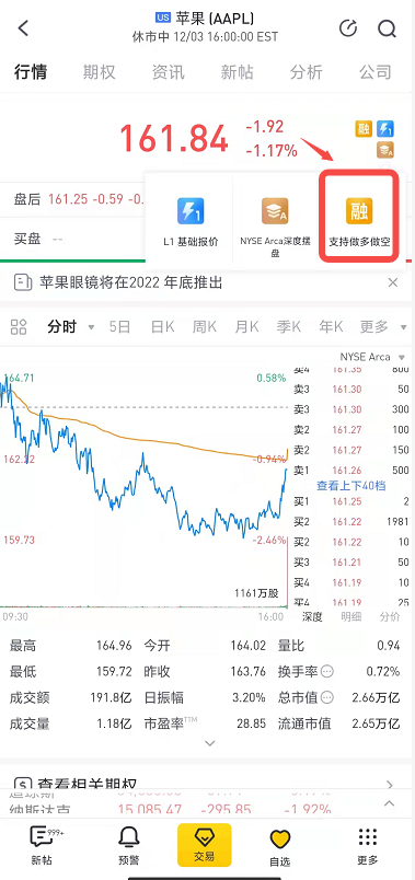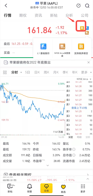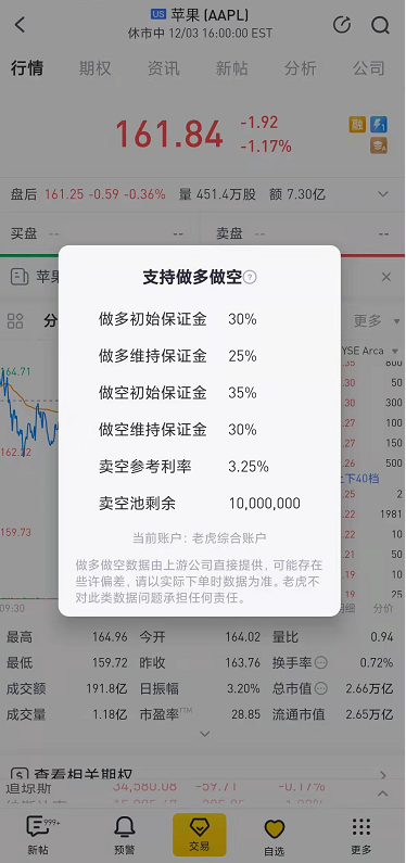 可以在每只股票的个股详情页上查看。以苹果为例,个股详情页右上方带有【融】字,代表这只股票支持融资,点击进去,就能看到具体的保证金情况。每只股票支持的融资杠杆可能都不太一样,主要与股票的融资初始保证金率有关。
