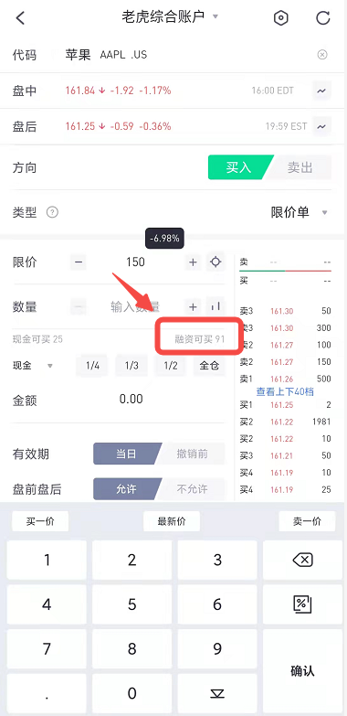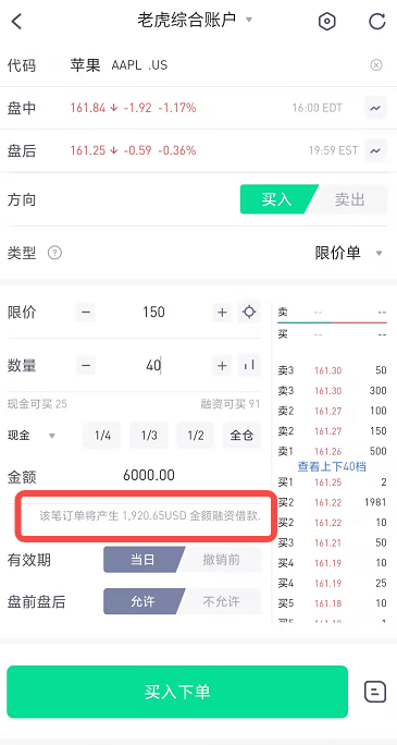 老虎的账户分保证金账户和现金账户,如果你是保证金账户(融资账户),就能进行融资交易。