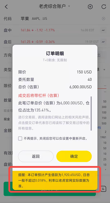 在下单页面输入价格和数量,点击下单后,我们可以看到订单明细页面,黄底部分显示了融资利息的说明。为适应货币汇率的变化,融资利率可能会周期性调整,具体利率以老虎官网实际数据为准:https://www.tigersecurities.com/help/detail/30304884。融资后如何还款
