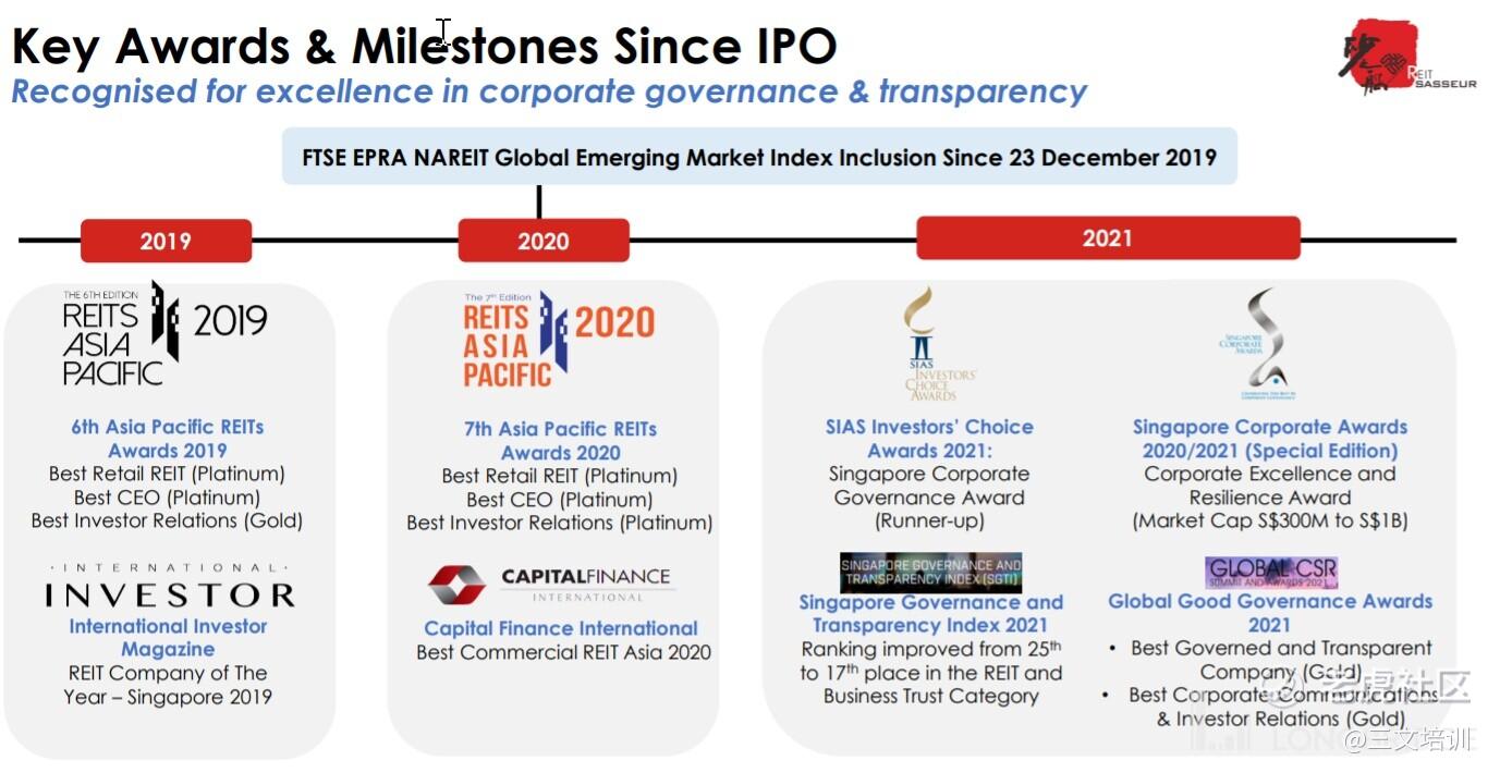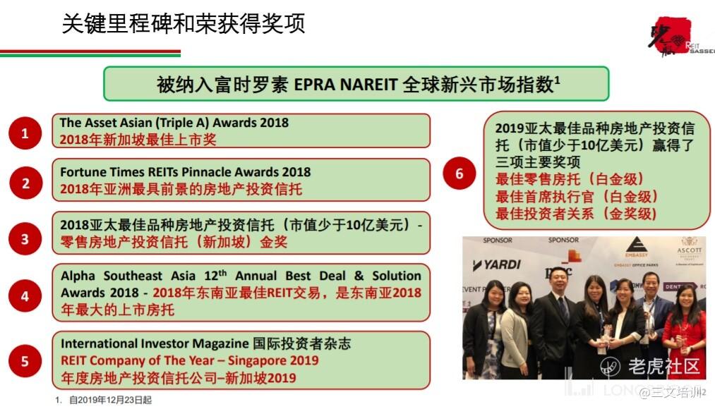 这是少数一家纯中国资产的 Reit,虽然上市时间不长,但这家 Reit 多次获得不同奖项,相信有相当的实力。