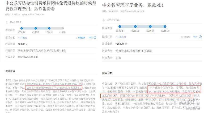 而此前,中公教育因为退款问题,还曾被学员举报至北京市场监管总局。