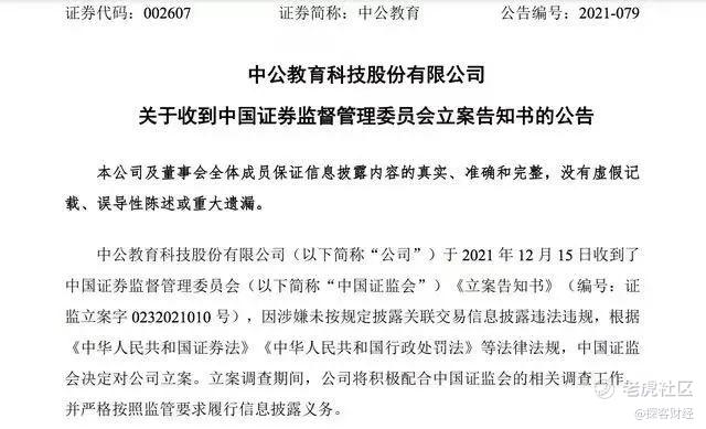12月16日晚间,中公教育发布公告,称公司于12月15日收到了中国证监会的《立案告知书》,因涉嫌未按规定披露关联交易信息披露违法违规,中国证监会决定对公司立案。