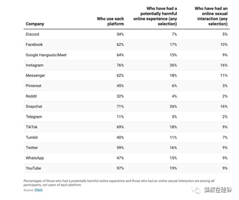 而在这些带有性企图的骚扰行为中,Instagram和Snapchat的问题最为严重,26%的类似骚扰都发生在这两大平台,其次则是TikTok和Facebook Messenger(均为18%)。显然图片和视频社交平台是青少年最容易遭到网络性骚扰的平台。