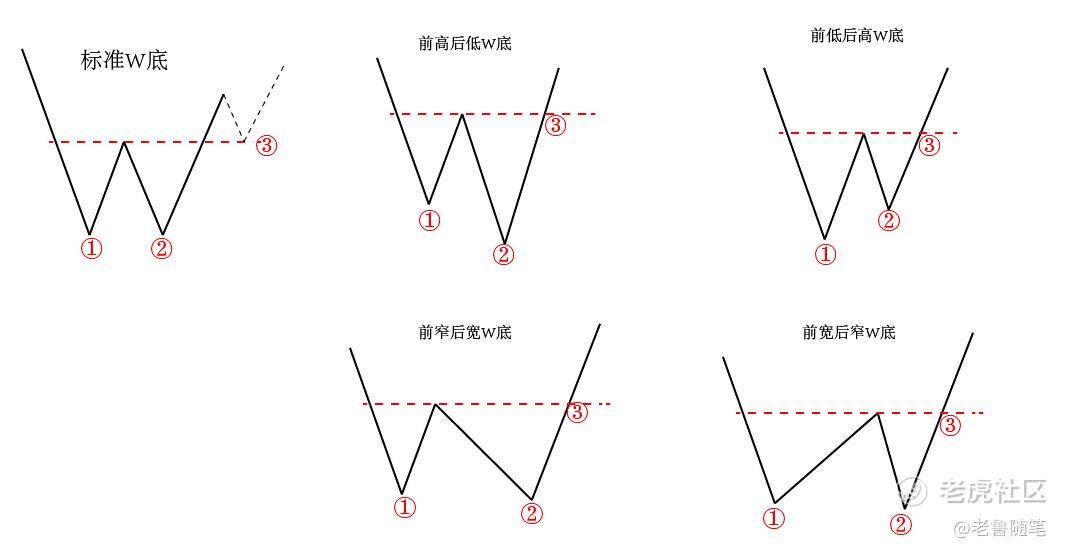 所以基于市场运行规律投资大佬们又总结出了后面的这些形态,【前高后低的W底形态】、【前低后高W底形态】、【前窄后宽W底形态】、【前宽后窄W底形态】,往后延伸一下的话还会有更多形态。
