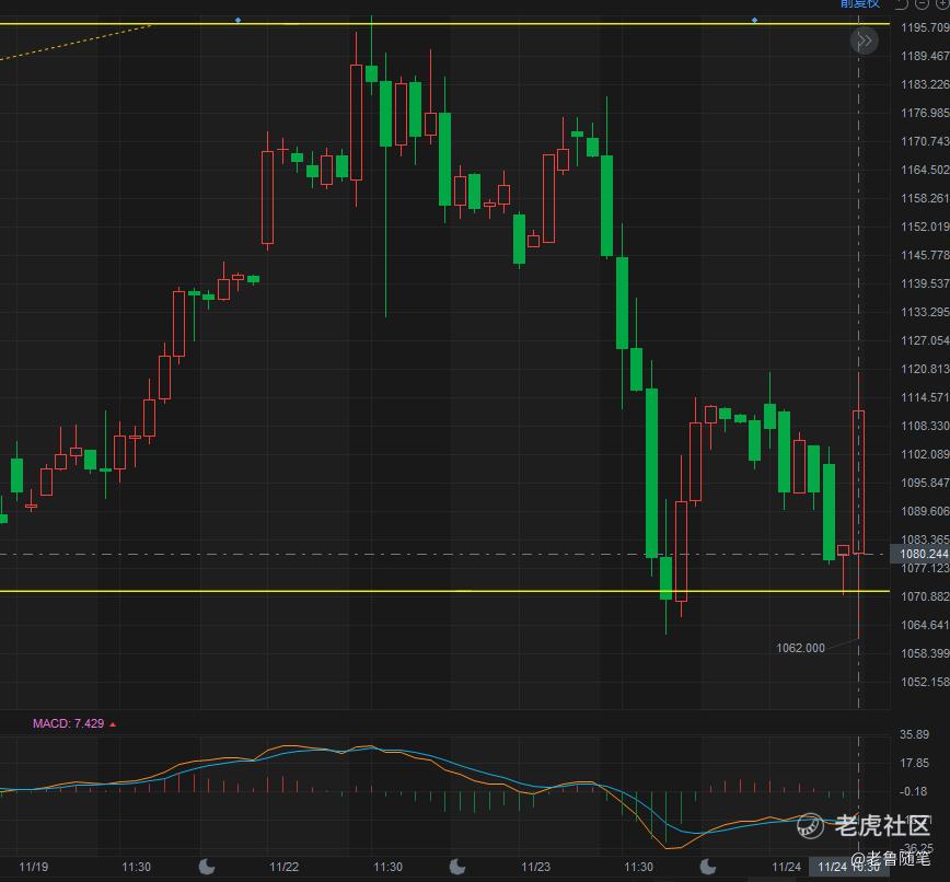 当时市场也挺赏脸,碰到压力位后直接立马掉头向下,迅速的触碰到1072附近点位,然后进行了反弹,我也是在24号开盘的时候直接卖出获利,大概是200%多的收益