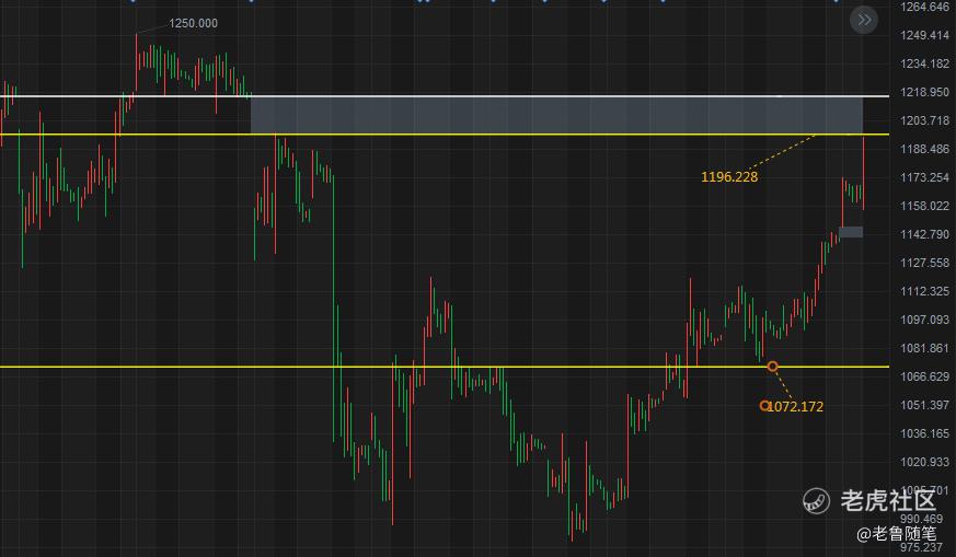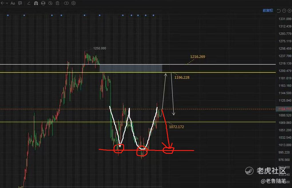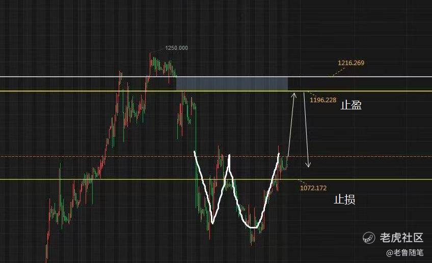 我们再来假设这笔交易是看跌的话,止损位就要打到1195附近了,那什么位置止盈呢,通过双底的结构很明显的看出,即使股价下跌,但是遇到前两次的底部依然会形成较强的支撑,短期跌破的可能性不大,所以止盈位置可以设置在1000价格附近,这样我们在计算下盈亏比:(1104-1000):(1195-1104) 大概是1:1