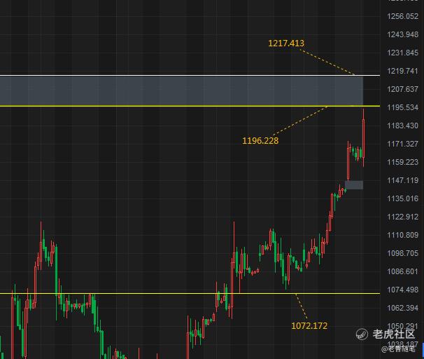 假设这笔交易我们看涨的话,很明显,止损位在1072附近,这个点位在之前获得过支撑,上方止盈点位短期可以看到1195附近,这里是一个很明显的缺口,通常股价遇到缺口会受到阻力,这样我们就可以简单的计算出这笔交易的盈亏比是 (1195-1104 ):(1104-1072)大概是3:1
