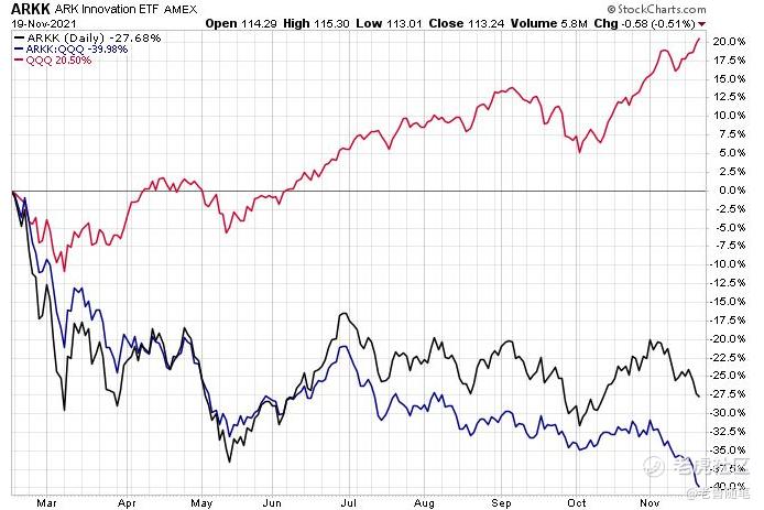 当然还有一部分人,跟着别人的观点进行买卖,看评论,看小道消息,这样做可能会有短暂的快乐,但持续性应该都不是很好,如果您有参与过跟单群的经历,我相信体会更深刻一些,去年红极一时的ark基金木头姐因为每天都公开持仓,受到散户的极力追捧,但是今年呢?妥妥的跑输纳指QQQ将近40%!即使明牌让你抄,估计你也会搞的一脸懵逼。