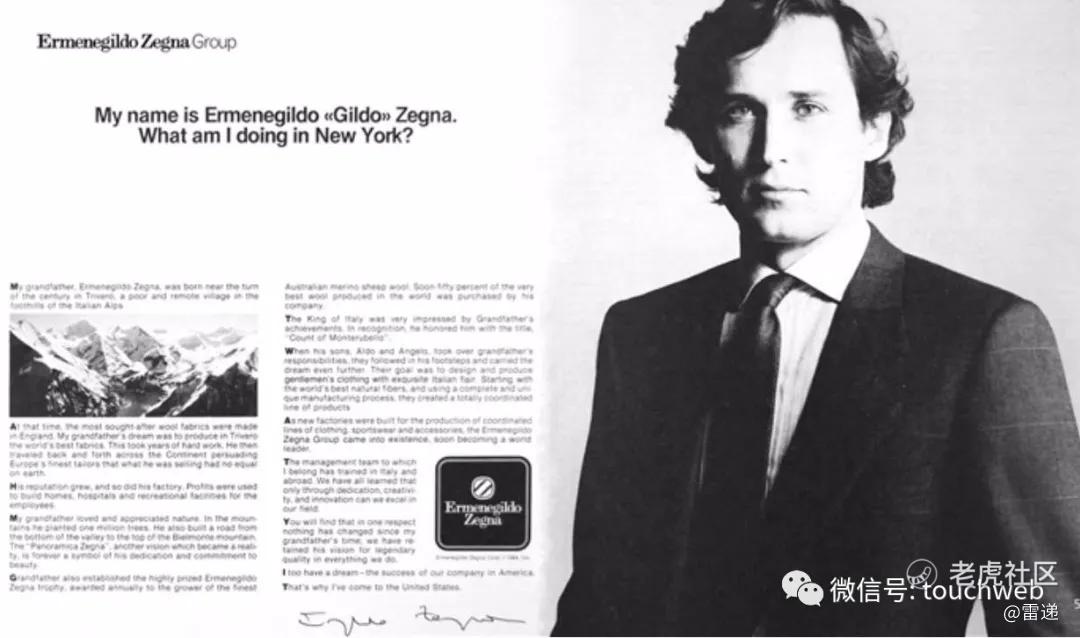 Zegna以这条公路为启发设计出作为代表品牌特征的标识,如今,Zegna已从最初的面料生产商,发展成为享誉全球的奢侈男装品牌,隶属于Zegna集团。