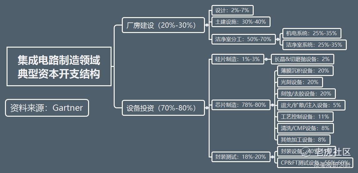 作为半导体产业的基石,半导体设备是推动集成电路技术创新的引擎,通常半导体设备的研发需要领先半导体工艺 3-5 年。半导体设备的技术迭代带来设备更新换代的需求,同时,设备厂商的技术进步也进一步推动了半导体行业的发展。据Gartner,集成电路制造设备投资一般占总资本支出的70%-80%,且随着工艺制程的提升,设备投资占比也将相应提高。