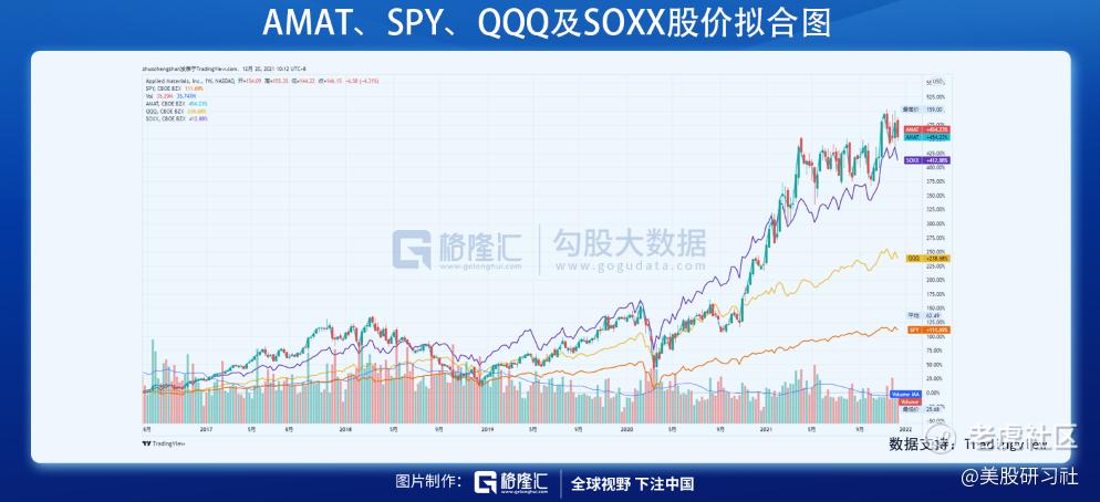 截止21年12月17日收盘,应用材料年内涨幅为70.56%,大幅跑赢同期纳指100ETF(QQQ:23.12%)、标普500指数ETF(SPY:24.64%)及费城半导体指数(SOXX:36.98%)的涨幅。